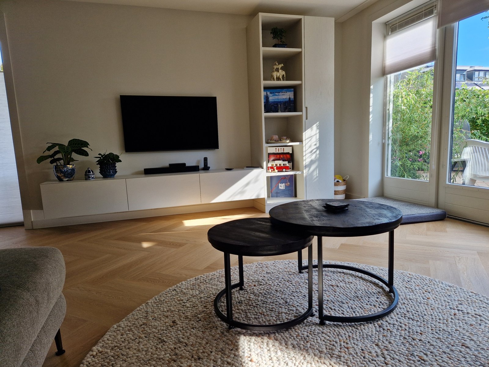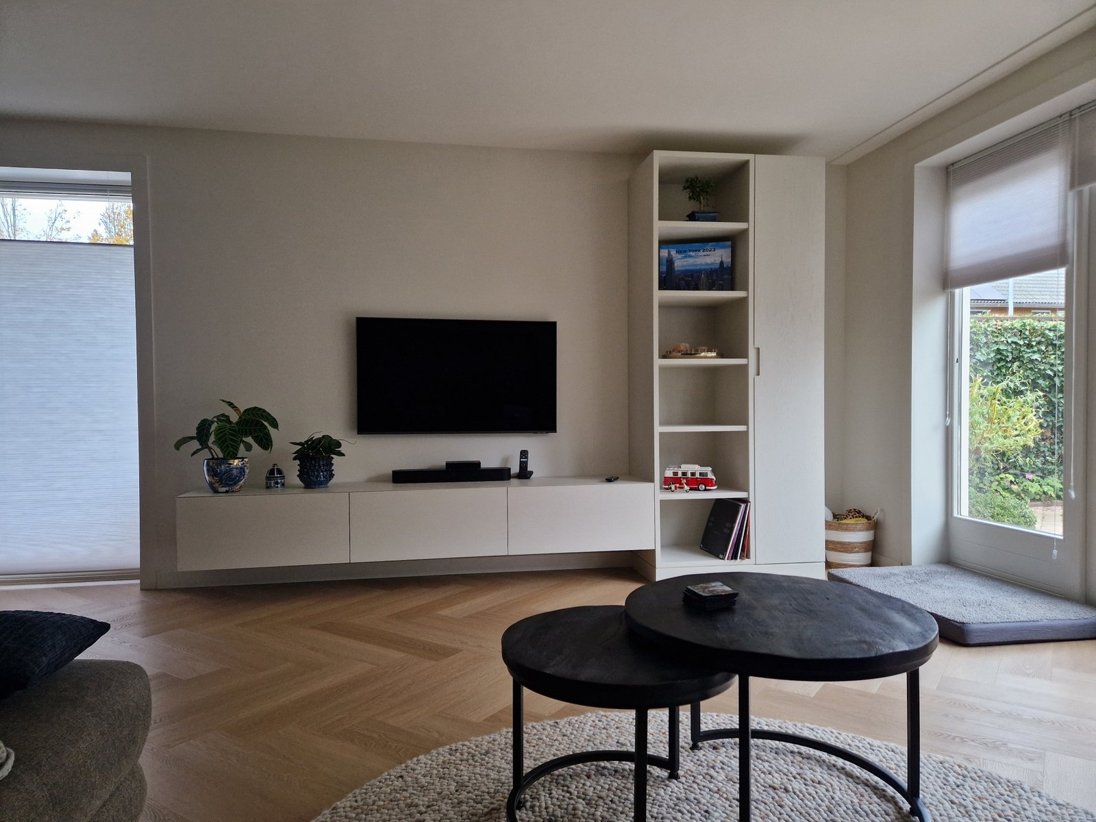 Tijdens onze inspiratiesessie gingen we samen op zoek naar de perfecte balans tussen rust en gezelligheid. We bekeken welke kleuren en materialen passen bij hun woonstijl en hoe we hun bestaande meubels konden combineren met nieuwe elementen. De witte structuurwanden maakten plaats voor een strakkere afwerking en een kleurenpalet met warme, natuurlijke tinten. Ook dachten we na over slimme indelingen en een op maat gemaakte kastenwand waarin zowel opbergen als etaleren een plek krijgt.